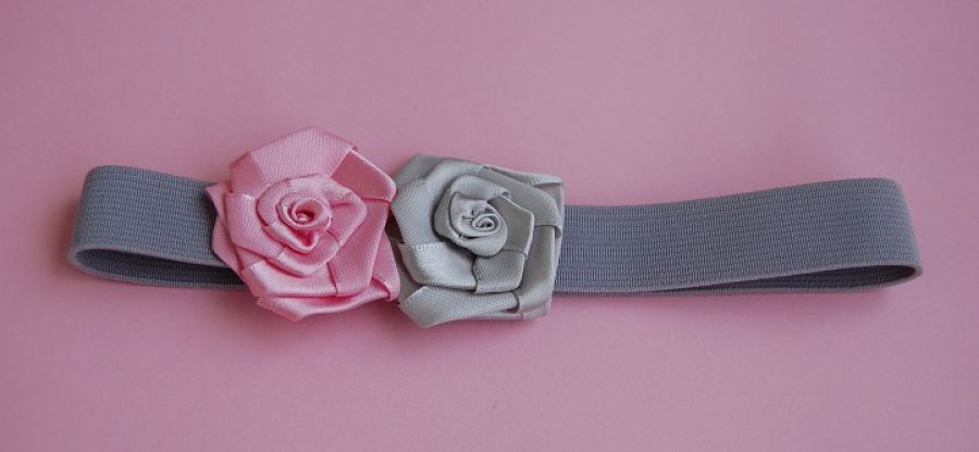 Opaska niemowlęca "Róż z szarym" - opaska do włosów ozdobiona dwoma kwiatami z satynowej taśmy. Opaska wykonana na elastycznej, rozciągliwej gumce w pastelowym, szarym kolorze.
