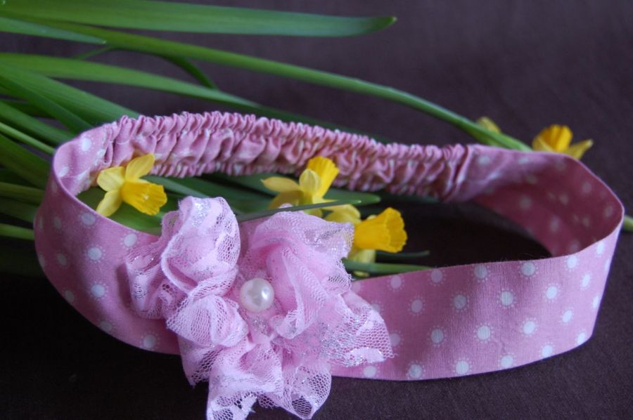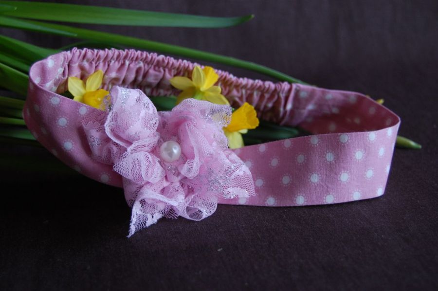 Opaska niemowlęca "Różowy koronkowiec z perłą" - wykonana z różowej bawełny w białe groszki, z tyłu na długości 13 cm wszyta rozciągliwa gumka ułatwiająca dopasowanie do małej główki. Ozdobiona na boku ręcznie wykonanym kwiatkiem z różowej koronki z dodatkiem srebrnej nitki. Na środku kwiatka przyszyta biała perła.