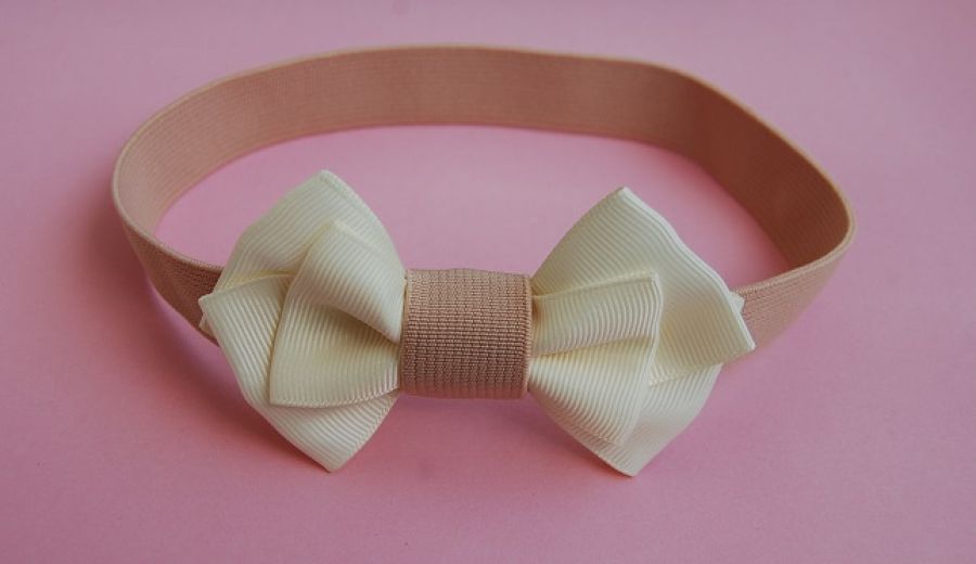 Opaska niemowlęca "Złamana biel z beżem" - opaska do włosów ozdobiona trzywarstwową kokardą z rypsowej taśmy w kolorze złamanej bieli. Opaska wykonana na elastycznej, rozciągliwej gumeczce w pastelowym, beżowym kolorze.