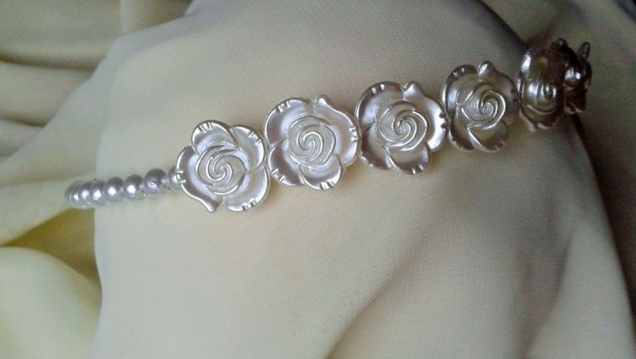 Na srebrnym stalowym pałąku oplecione białe akrylowe perełki i kwiatków róży.