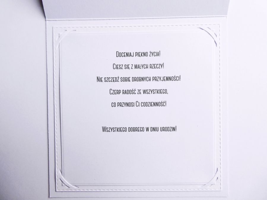 Kartka ma wklejony w środku biały karnecik, w którym umieszczona została wkładka z życzeniami.