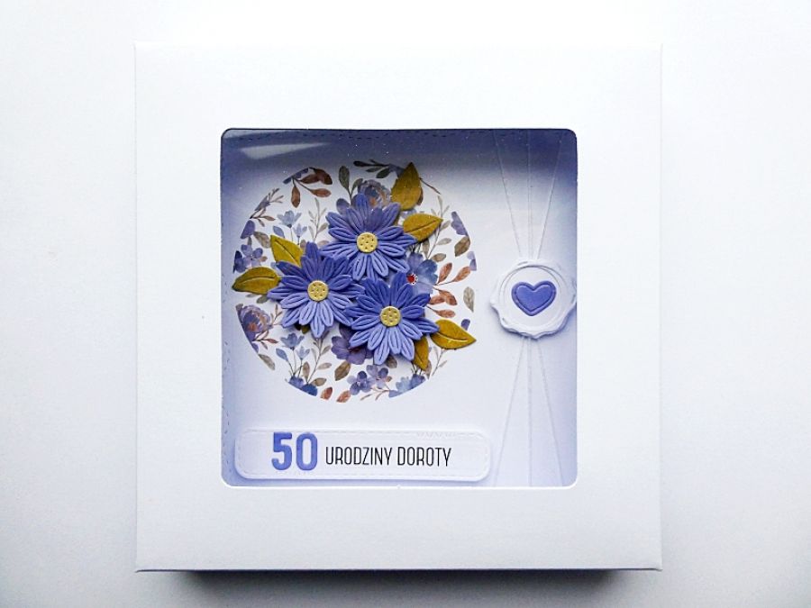 Ręcznie wykonana kartka na urodziny w komplecie z pudełkiem z okienkiem.