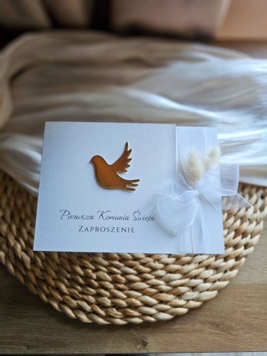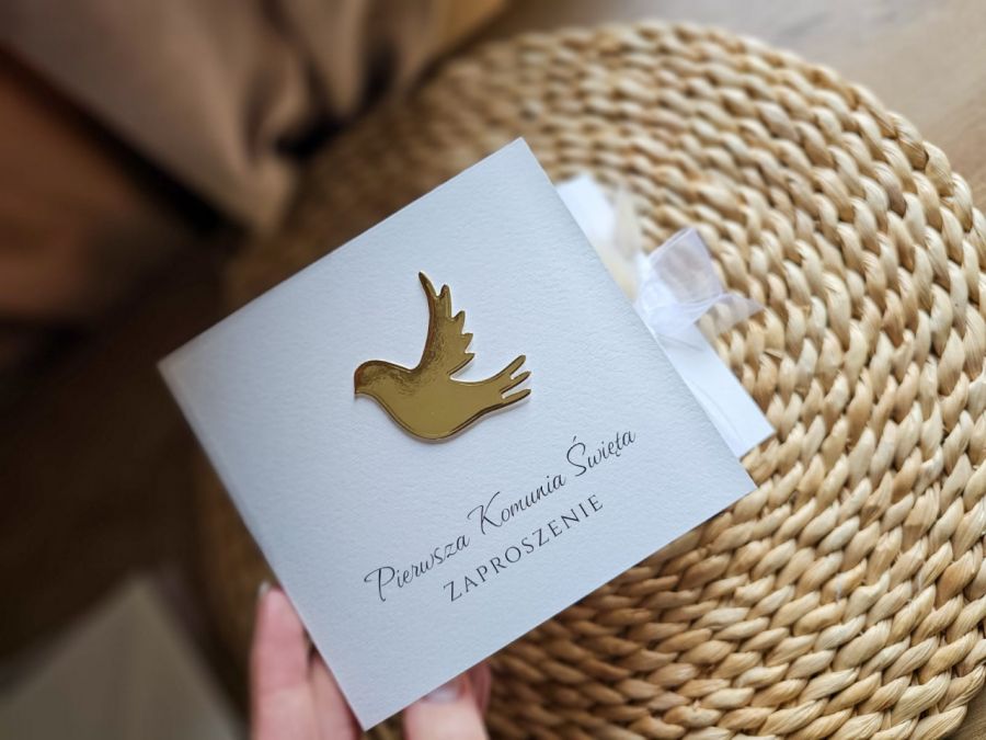 Eleganckie zaproszenie na Pierwszą Komunię Świętą – wzór asymetrycznie składany, dzięki czemu po otwarciu nadal mamy widoczną dekorację po prawej stronie, front zdobiony złotą gołębicą.