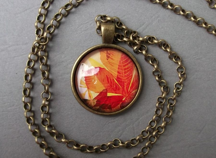 Naszyjnik z jesienną grafiką. Oprawa w kolorze starego złota.