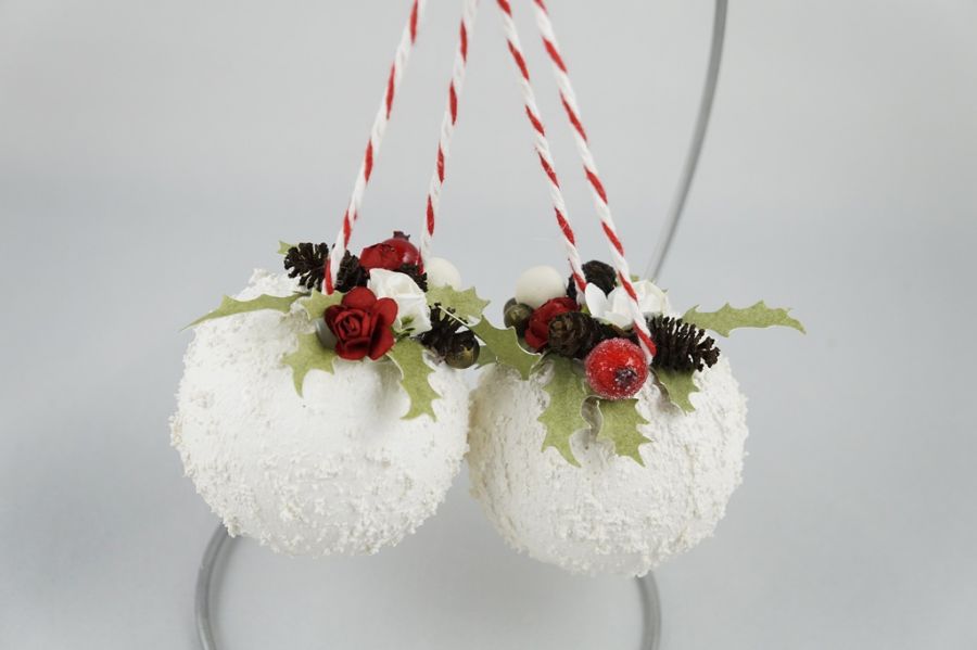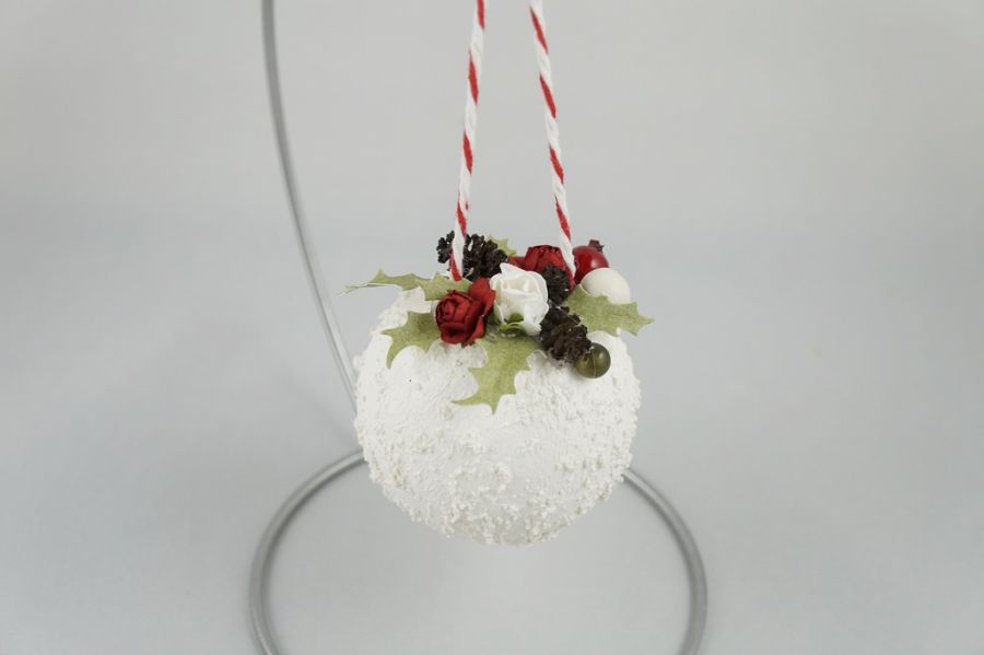 Bombka wykonana jest na bazie kuli styropianowej, pokryta warstwą pasty strukturalnej imitującej śnieg lub szron. Wokół sznureczka - zawieszki, kompozycja z papierowych listków ostrokrzewu, owoców głogu, szyszek i kwiatów.
