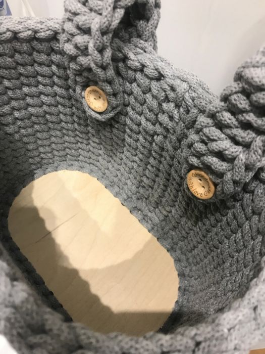 Duży kosz owalny do powieszenia z drewnianymi guzikami.