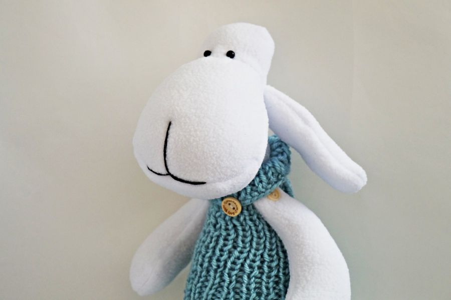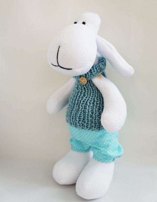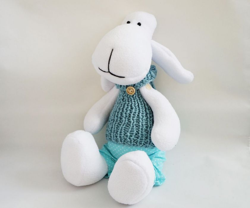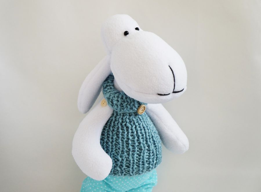 Mięciutka owieczka uszyta z białego polaru. Ubrana w spodenki i sweterek z miękkiej włóczki. Oczka z koralików. Idealna dla małej dziewczynki, lub chłopca (nie wskazane dla dzieci poniżej 3 roku życia).