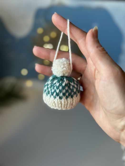 Ozdoba choinkowa mini-czapeczka, wykonana ręcznie na drutach z naturalnej włóczki z wełny owczej.