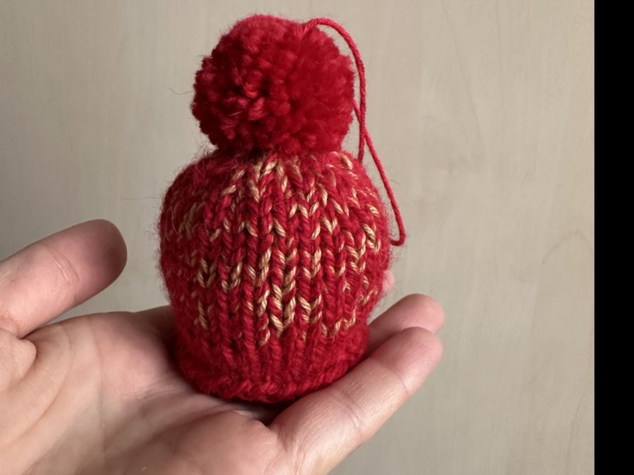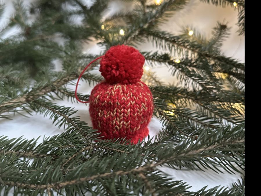 Ozdoba choinkowa mini-czapeczka, wykonana ręcznie na drutach z naturalnych włóczek składających się z wełny, alpaki oraz bawełny.