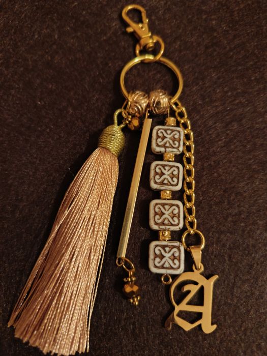 Niepowtarzalna ozdobna zawieszka do Twojej torby lub plecaczka. Utrzymana w ciepłej kolorystyce beżu i złota. metalowe elementy w kolorze złotym dopełnione klasycznym, beżowym chwostem i czterema rzeźbionymi, ceramicznymi koralikami. Umieściłam również gotycką literkę A (np. dedykowana Ani, Ali, Alicji, Agacie). Oczywiście mogę ją wymienić na inny ozdobnik. Całkowita długość zawieszki to 14 cm.