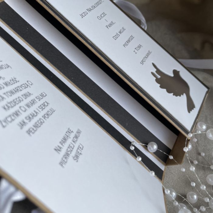 posiada specjalny ogranicznik, który stabilizuje zawartość – dzięki temu prezent nie przesuwa się i wygląda perfekcyjnie po otwarciu, wewnątrz znajdują się gotowe życzenia komunijne.