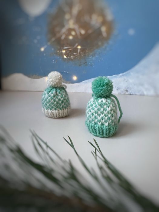 Zestaw 2 szt. zawieszek choinkowych, mini-czapeczek, wykonanych ręcznie na drutach z wełny owczej.