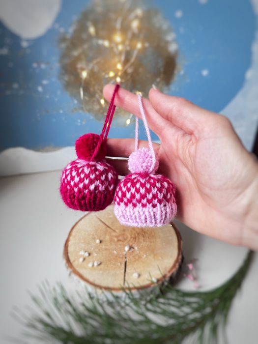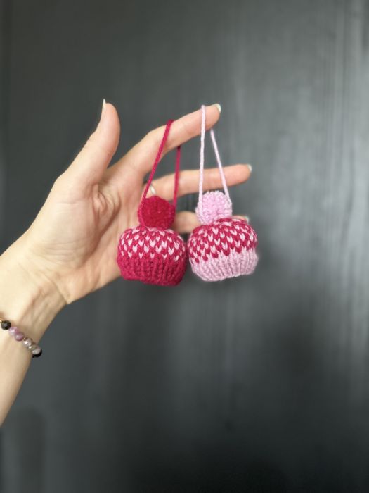 Zestaw 2 szt. zawieszek choinkowych, mini-czapeczek, wykonanych ręcznie na drutach z wełny owczej.