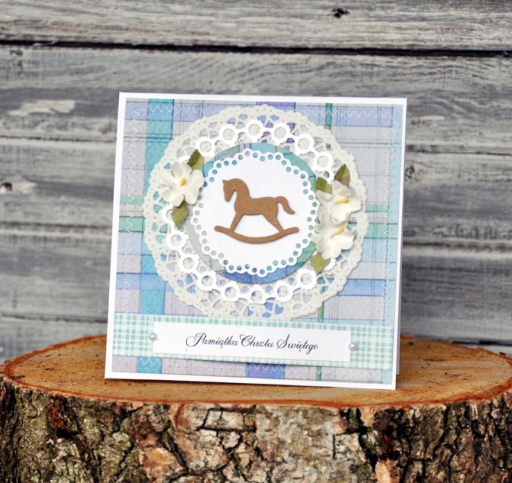 Piękna i wyjątkowa kartka dla dziecka z okazji Chrztu Św.; ozdobiona szwami maszynowymi, kwiatami, koronką, wstążką; rozmiar 13x13cm, w komplecie koperta; zapraszam