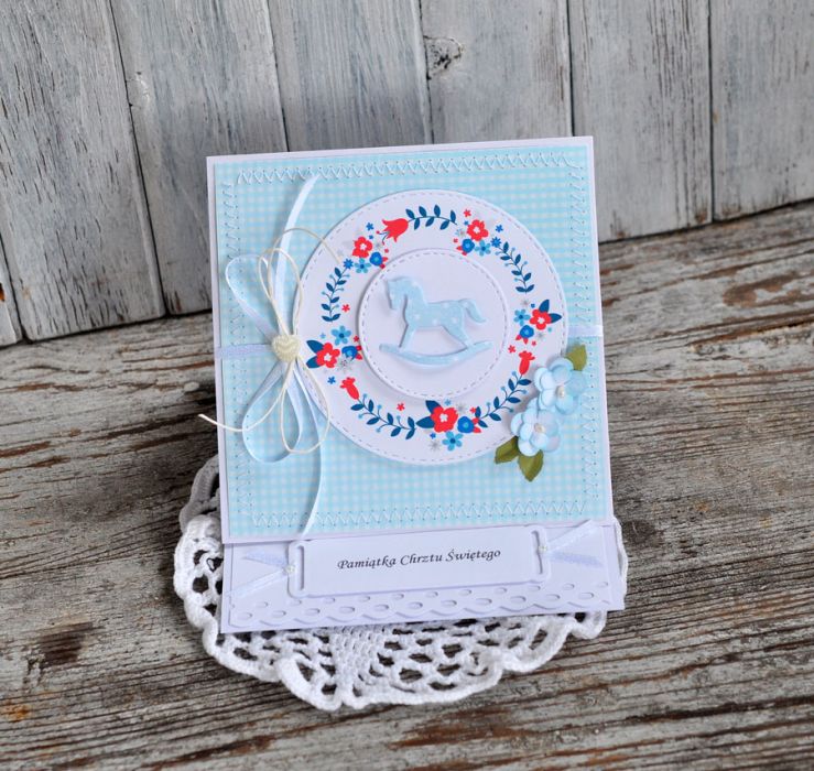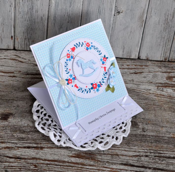 Piękna i wyjątkowa kartka-sztalugowa, dla dziecka z okazji Chrztu Św.; wykonana metodą scrapbookingu; rozmiar 13x13cm, w komplecie koperta; zapraszam