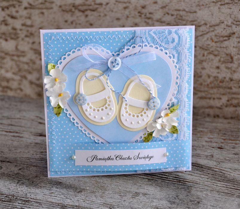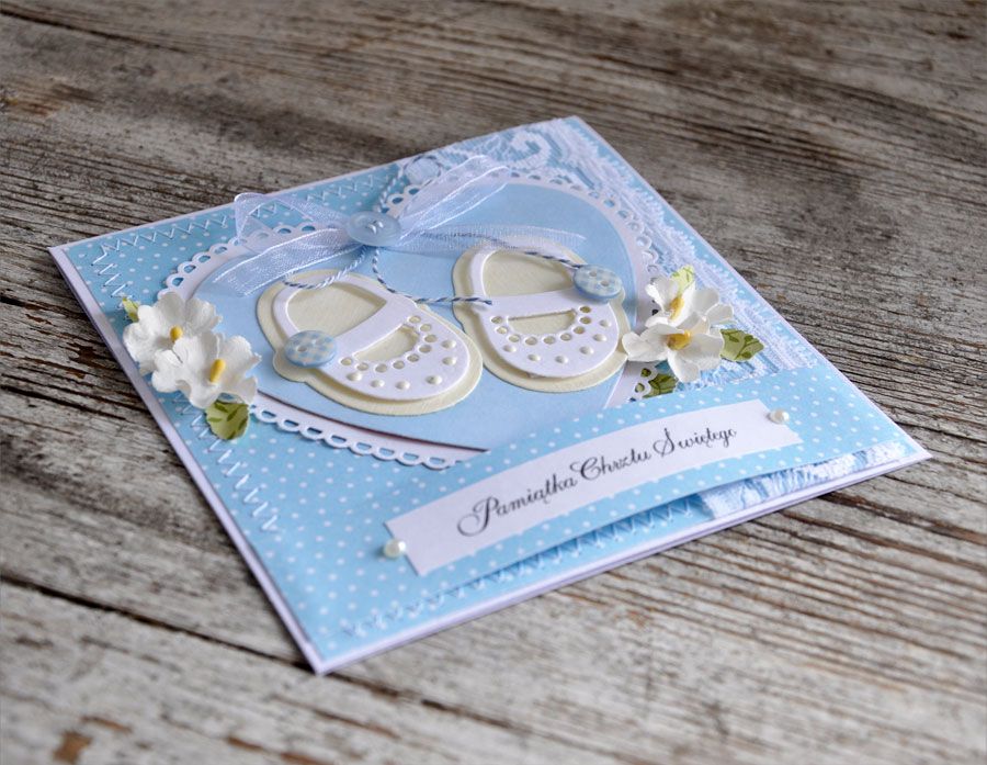 Piękna i wyjątkowa kartka dla dziecka z okazji Chrztu Św.; ozdobiona szwami maszynowymi, kwiatami, koronką, wstążką; rozmiar 13x13cm, w komplecie koperta; zapraszam