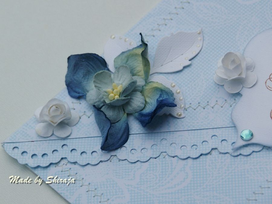 Wyjątkowa kartka, na wyjątkową okazję. Wykonana z wysokiej jakości papierów do scrapbookingu. Ozdobiona papierowymi kwiatami, listkami, oraz kryształkami i perełkami. W środku wkładka na życzenia.