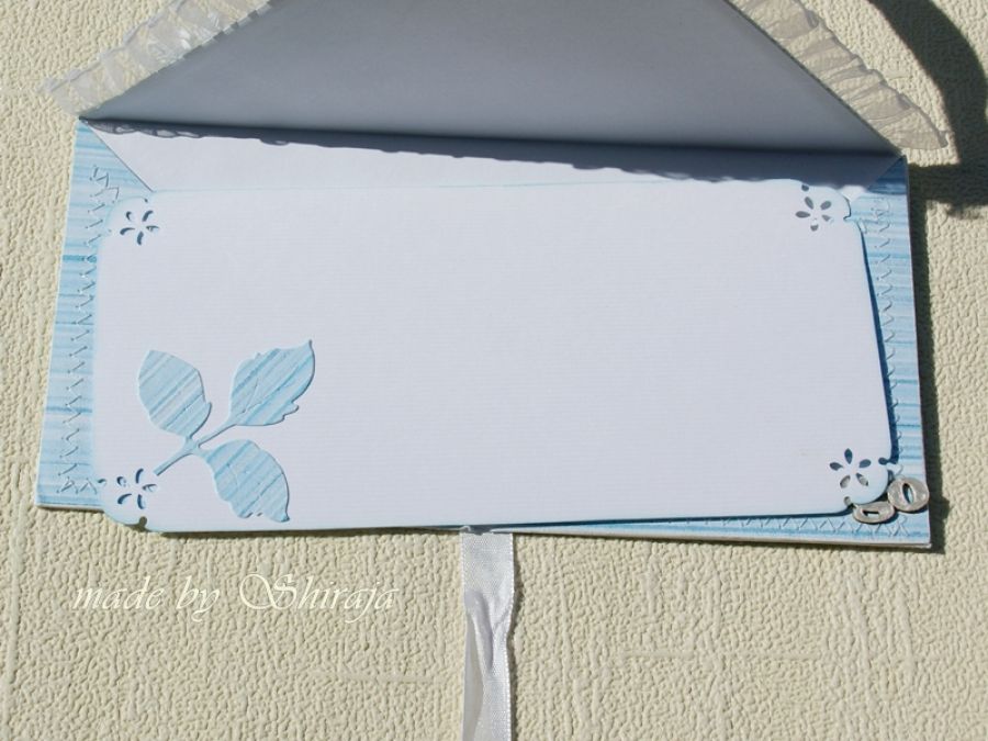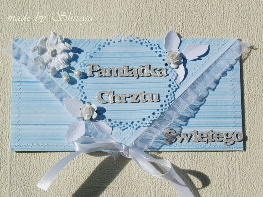 Piękna pamiątka Chrztu św. dla chłopca, w formie eleganckiej kopertówki. Ozdobiona papierowymi kwiatami i delikatnymi listkami, przeszywana maszynowo. Napis pokryty perłową farbką. W środku wkładka na życzenia.