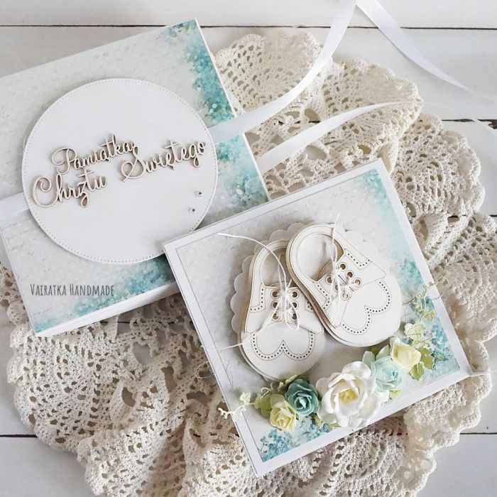Delikatna kartka - pamiątka chrztu świętego - w pudełku. Głównym motywem są urocze chłopięce buciki okolona bukietem papierowych kwiatów i listków. Wszystkie elementy podklejone kosteczkami 3d, dzięki czemu kartka jest bardzo przestrzenna. Razem z pasującym pudełkiem stanowi idealny prezent - lub dodatek do prezentu.