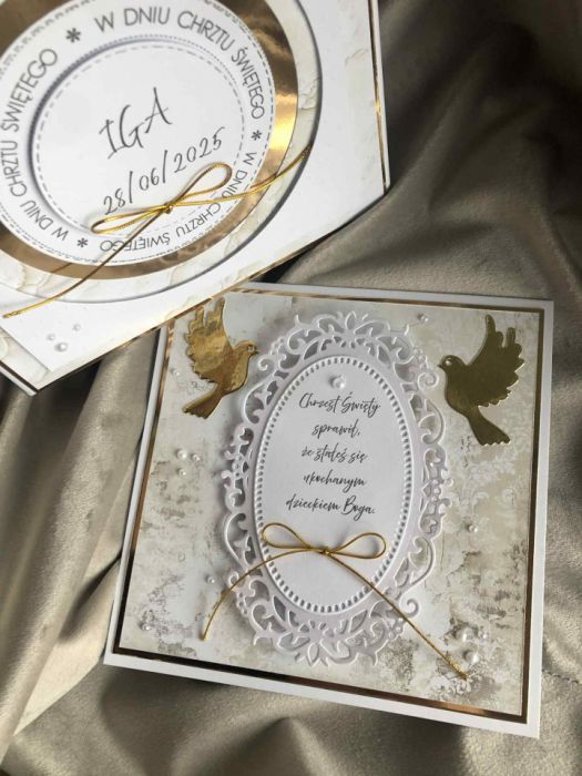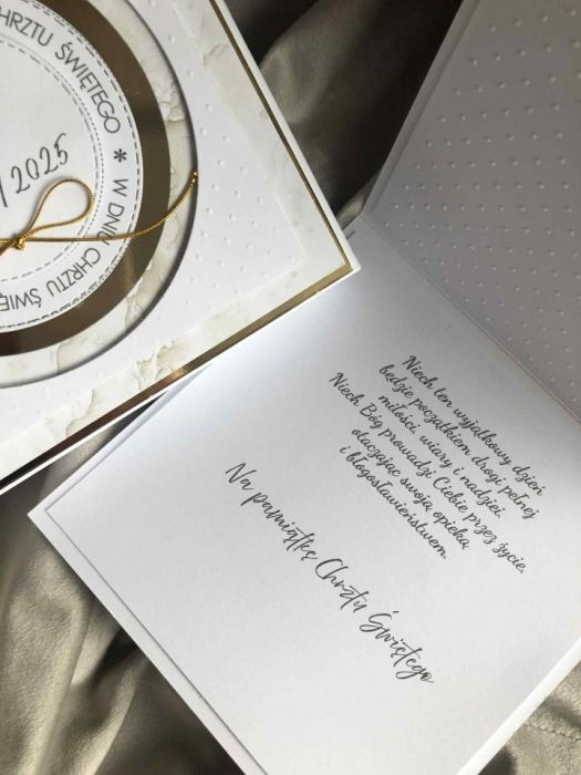 Delikatna i elegancka forma przekazania życzeń oraz prezentu z okazji Chrztu Świętego – idealna zarówno dla chłopca, jak i dziewczynki. Całość utrzymana w stonowanej, klasycznej kolorystyce, z dbałością o każdy detal.