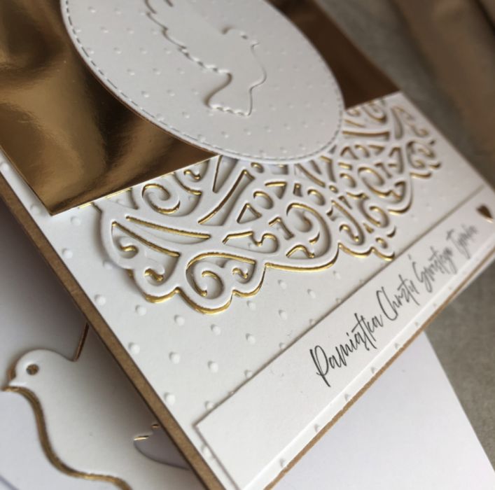 Ekskluzywna kartka z okazji Chrztu Świętego, wykonana z wytłaczanego papieru w odcieniach bieli, ozdobiona detalami w odcienach lustrzanego złota. Centralnym motywem jest gołąb – symbol Ducha Świętego i czystości, który nadaje kartce głębokiego, duchowego znaczenia. Idealna jako pamiątka od rodziców chrzestnych, dziadków lub bliskich.