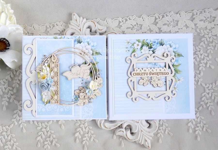 Warstwowa kartka na chrzest ozdobiona ślicznymi papierami scrapowymi polskich producentów, laserowo wycinanymi tekturkami, kwiatami oraz innymi dodatkami.