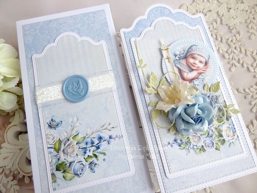 Warstwowa kartka na chrzest w pudełku z okienkiem, bogato zdobiona ślicznymi papierami polskich producentów, grafikami oraz kompozycją kwiatową.