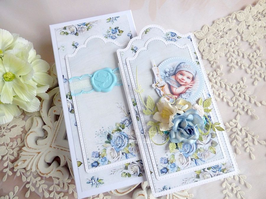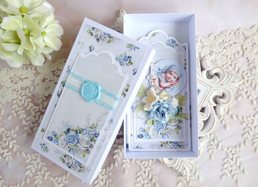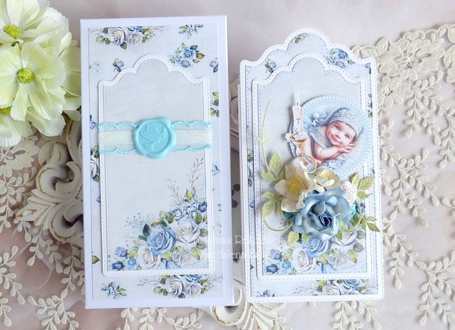 Warstwowa kartka na chrzest w pudełku z okienkiem, bogato zdobiona ślicznymi papierami polskich producentów, grafikami oraz kompozycją kwiatową.