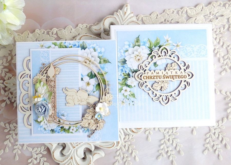 Warstwowa kartka na chrzest ozdobiona ślicznymi papierami scrapowymi polskich producentów, laserowo wycinanymi tekturkami, kwiatami oraz innymi dodatkami.