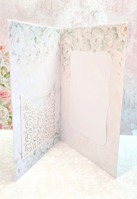 W komplecie do kartki dołączona jest ręcznie robiona, ozdobna koperta z wytłaczanym wzorem, przewiązana delikatną wstążką.