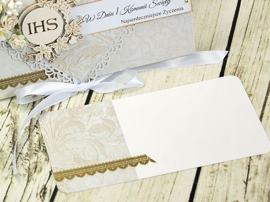 Elegancka i delikatna kartka kopertówka wykonana z wysokiej jakości papierów do scrapbookingu, obszywana maszynowo. Kartka ozdobiona papierowymi kwiatami oraz Hostią,. W środku znajduje się wkładka na życzenia. Wymiary 21cmx 10,5cm. W komplecie z kopertą. Kartka będzie oryginalnym dopełnieniem prezentu lub podarunkiem samym w sobie. Istnieje możliwość dodaniażyczeń.