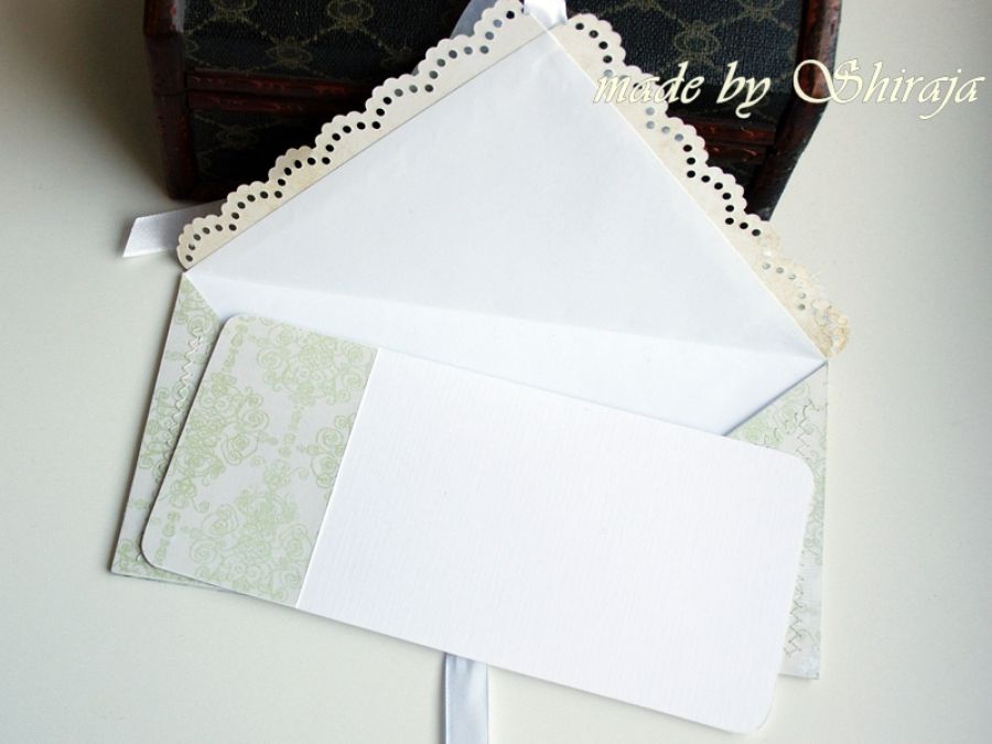 Elegancka i delikatna kartka kopertówka wykonana z wysokiej jakości papierów do scrapbookingu, obszywana maszynowo. Kartka ozdobiona papierowymi kwiatami, listkami, perełkami. W środku znajduje się wkładka na życzenia .