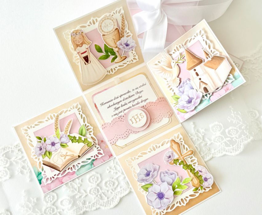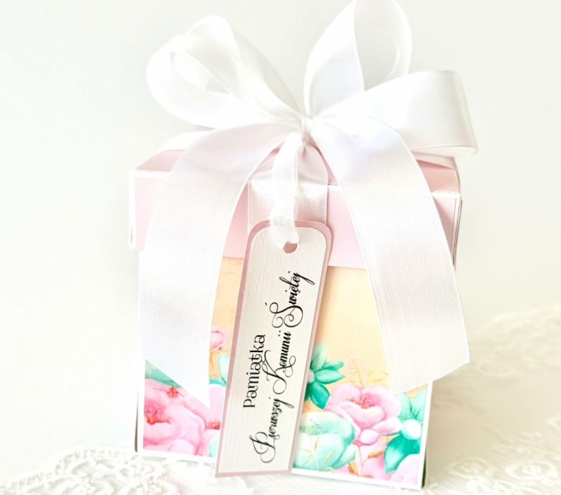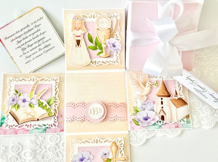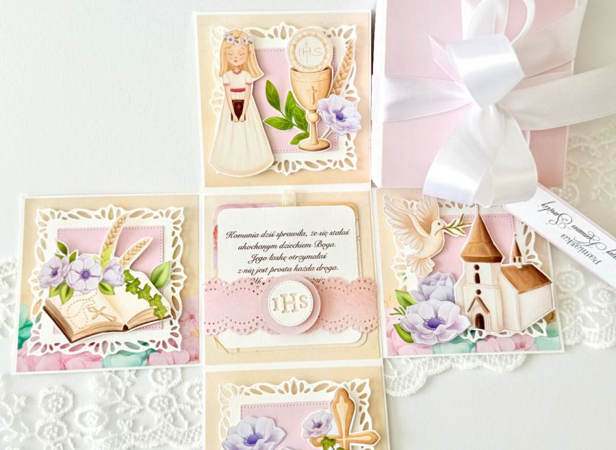 Komunijny exploding box jest idealnym "opakowaniem" prezentu w postaci gotówki na uroczystość Pierwszej Komunii Świętej. Po zdjęciu wieczka gwarantowany jest efekt "wow!"
