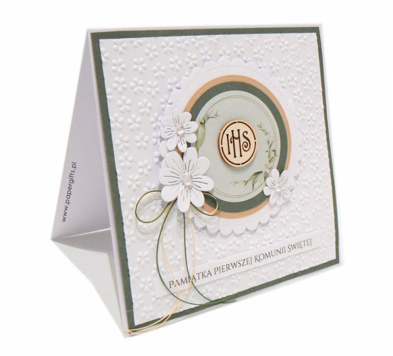 Wykonana na bazie papieru 250 g, tło z tłoczonego papieru, z delikatnymi sznureczkami, na środku ręcznie wycinane elementy, grafika z wiankiem z liści oraz monogram IHS. W środku życzenia: "Dziś jeden z najpiękniejszych dni w życiu Twoje pierwsze, tak bliskie spotkanie z Panem Jezusem. Zachowaj ten dzień głęboko w pamięci i w sercu! Obfitych Łask Bożych na całe życie w dniu Pierwszej Komunii Świętej."