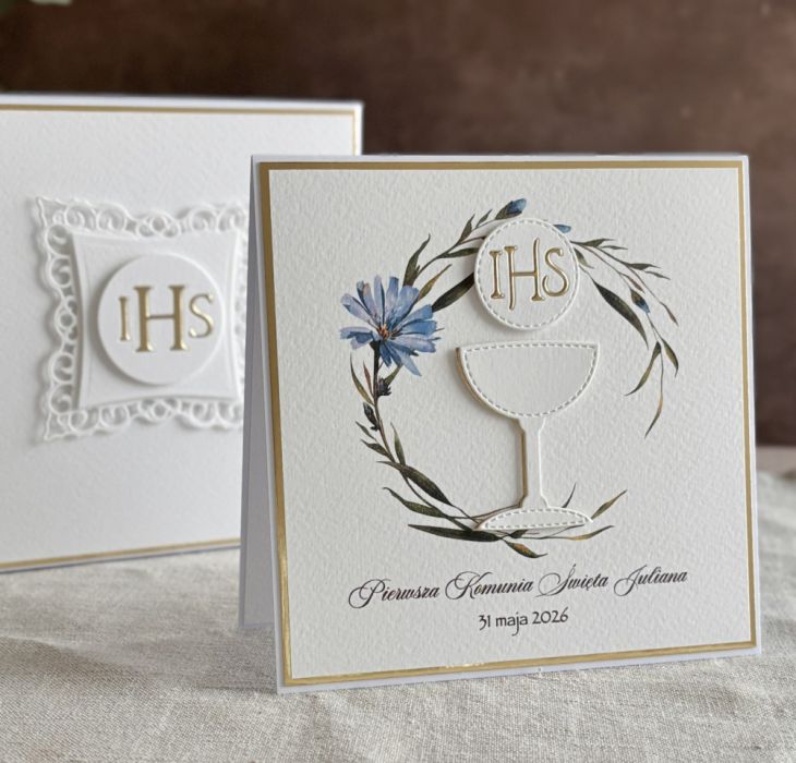 Pamiątka z delikatnym wiankiem graficznym i ręcznie wyciętą biało-złotą ozdobą.