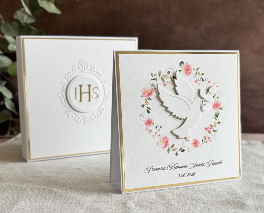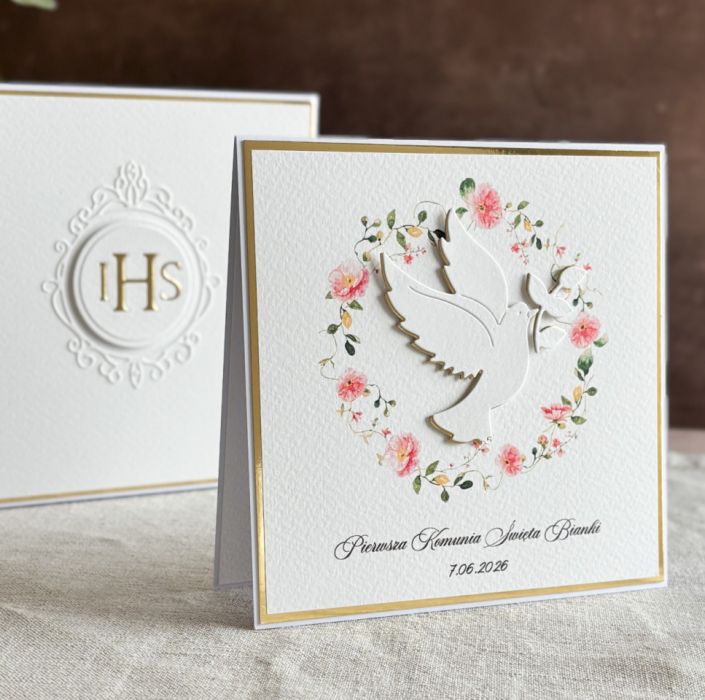 Pamiątka z delikatnym wiankiem graficznym i ręcznie wyciętą biało-złotą ozdobą.