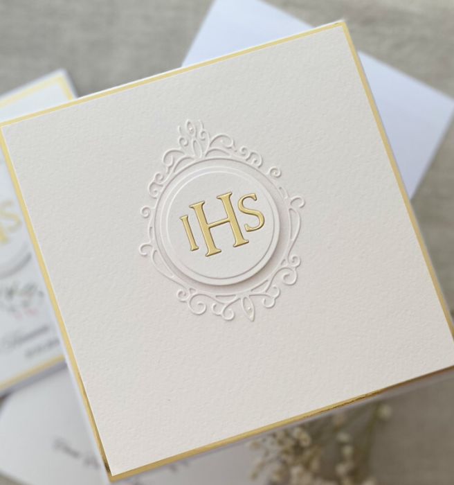 LINA GOLD to seria oryginalnych i eleganckich pamiątek oraz zaproszeń w której delikatny, włoski papier w odcieniu bieli jest połączony ze złotym papierem lustrzanym.