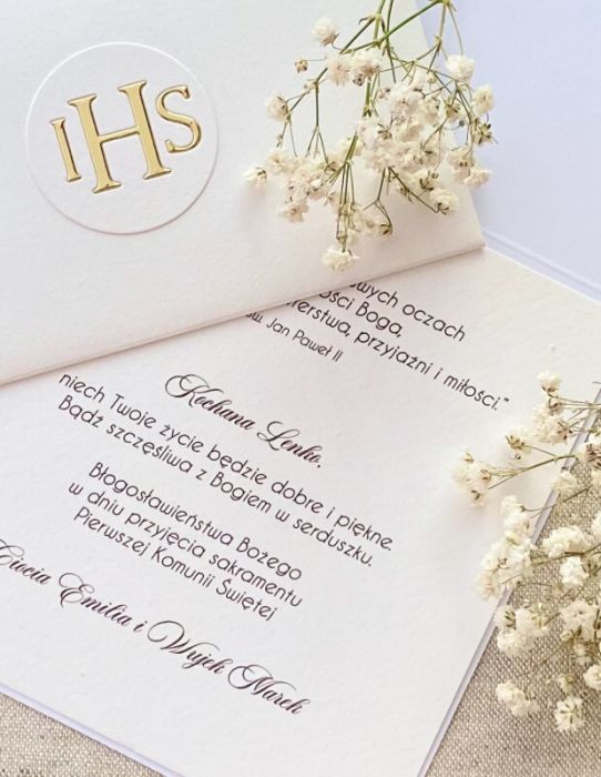 Pamiątka z delikatnym wiankiem graficznym i ręcznie wyciętą biało-złotą ozdobą. Zestaw z naszej autorskiej kolekcji - Linia Gold.