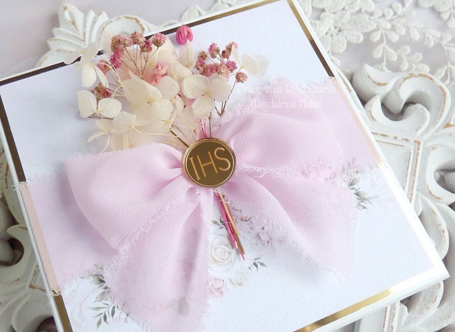 Pamiątka komunijna w drewnianym pudełku bielonym na zewnątrz, bogato zdobiona pięknymi papierami scrapowymi polskich producentów, dodatkami z lustrzanego złota, suszonymi kwiatami oraz ręcznie rwaną wstążką szyfonową.