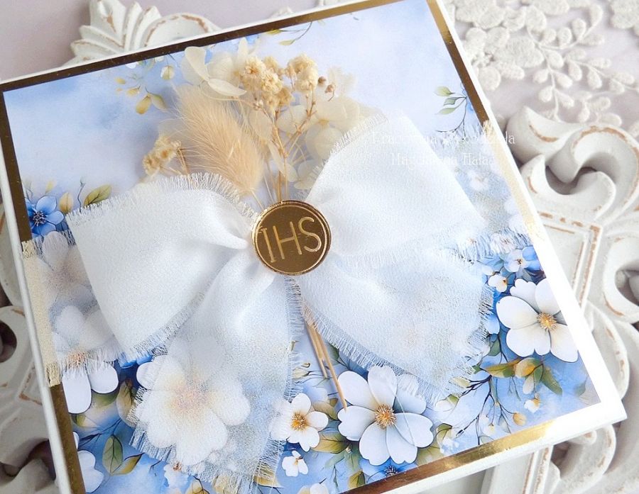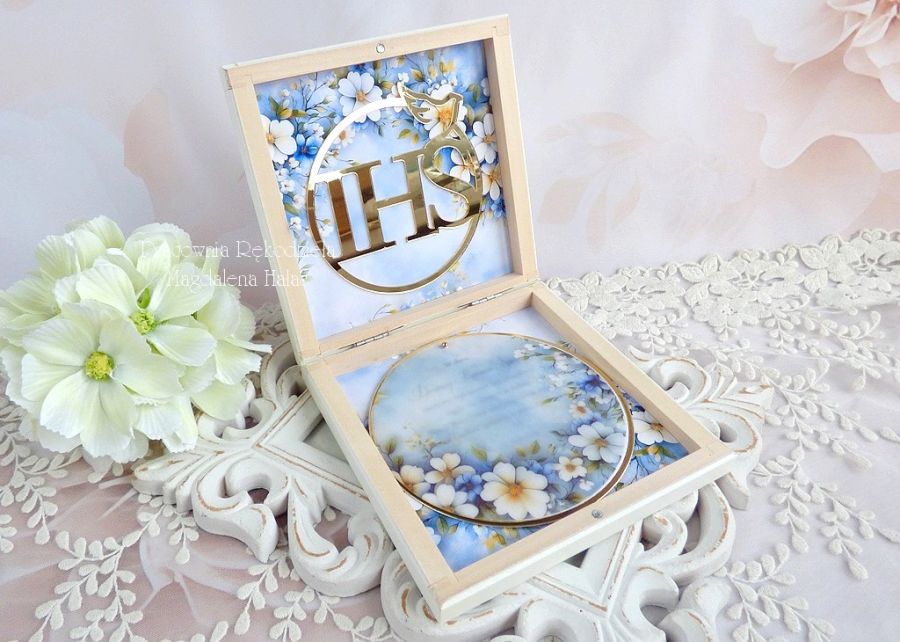 Pamiątka komunijna w drewnianym pudełku bielonym na zewnątrz, bogato zdobiona pięknymi papierami scrapowymi polskich producentów, dodatkami z lustrzanego złota, suszonymi kwiatami oraz ręcznie rwaną wstążką szyfonową.