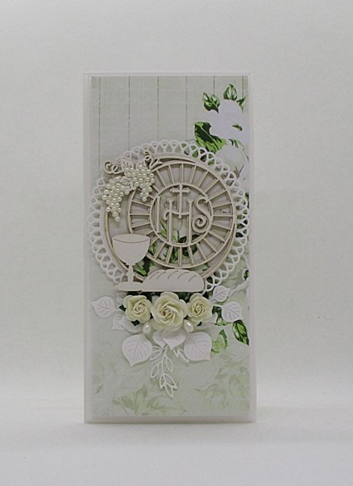 Elegancka kartka z okazji Pierwszej Komunii Świętej z piękną tekturką w ozdobnym pudełku.