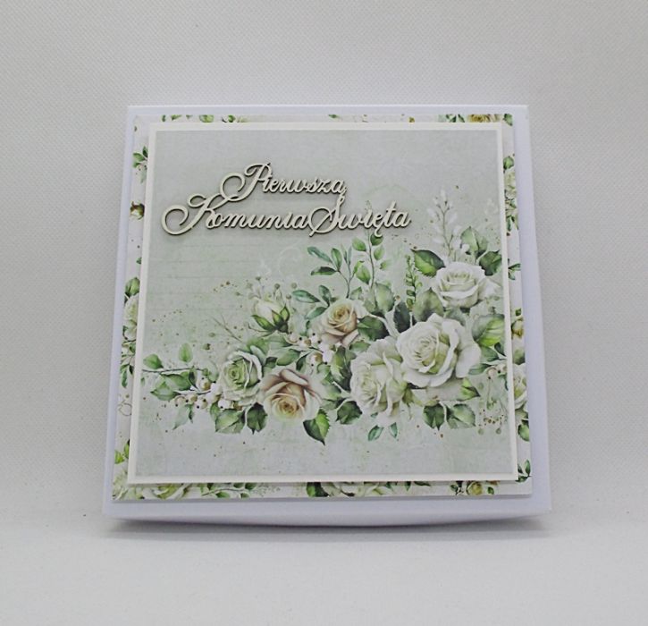 Elegancka kartka z okazji Pierwszej Komunii Świętej z piękną tekturką w ozdobnym pudełku.