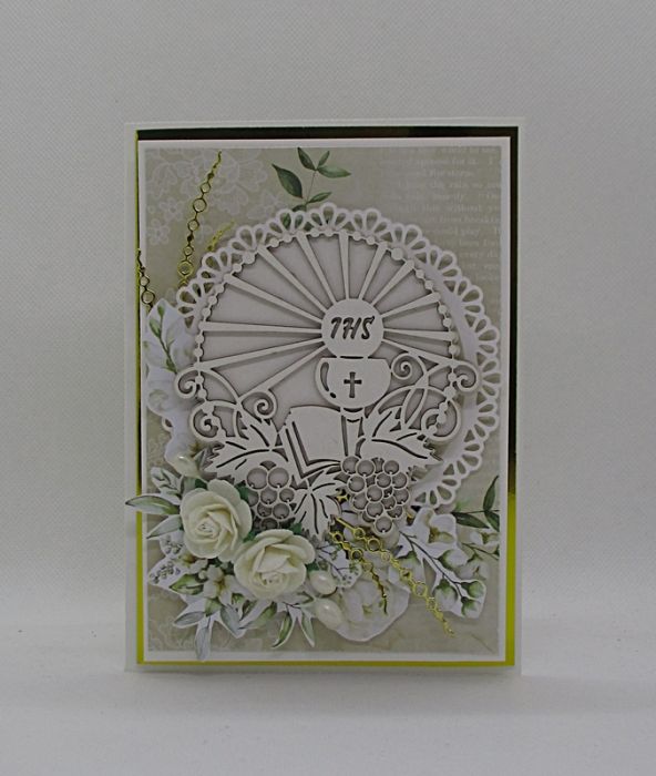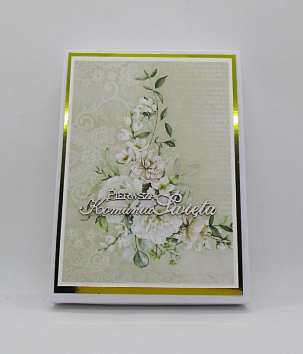 Elegancka kartka z okazji Pierwszej Komunii Świętej z piękną tekturką w ozdobnym pudełku.