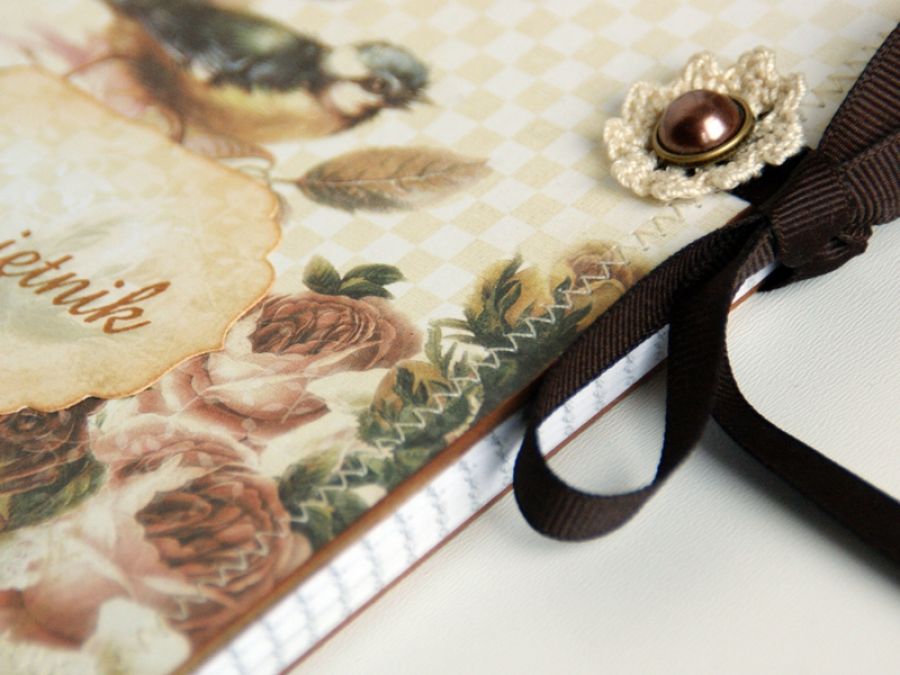 Notes A5 wykonany z wysokiej jakości papierów do scrapbookingu obszywanych maszynowo. Ozdobiony szydełkowym kwiatem, motylkami, oraz zawieszką- buteleczką z koralikami. Wiązany na wstążeczkę.