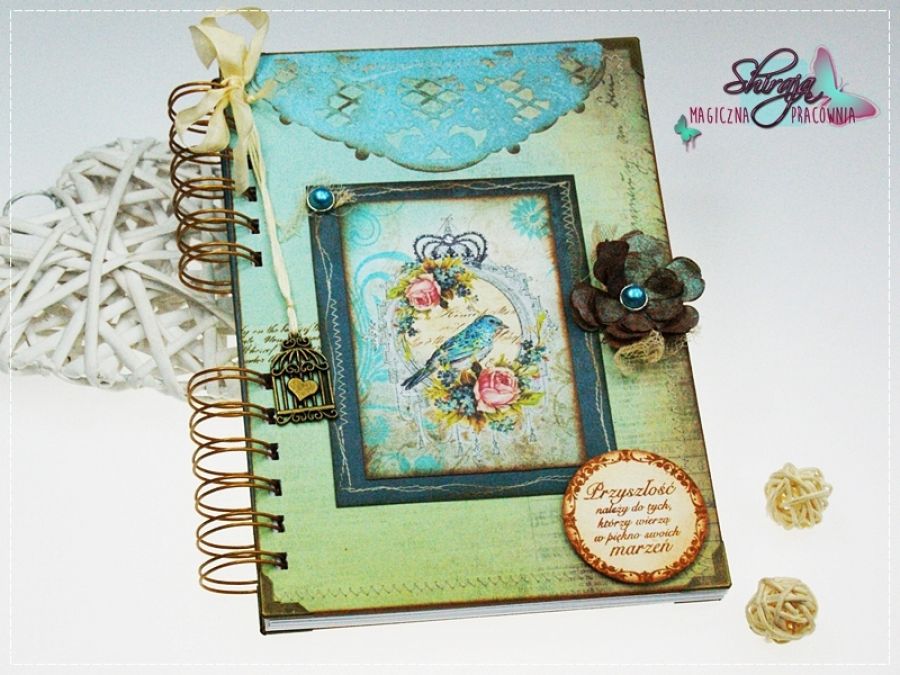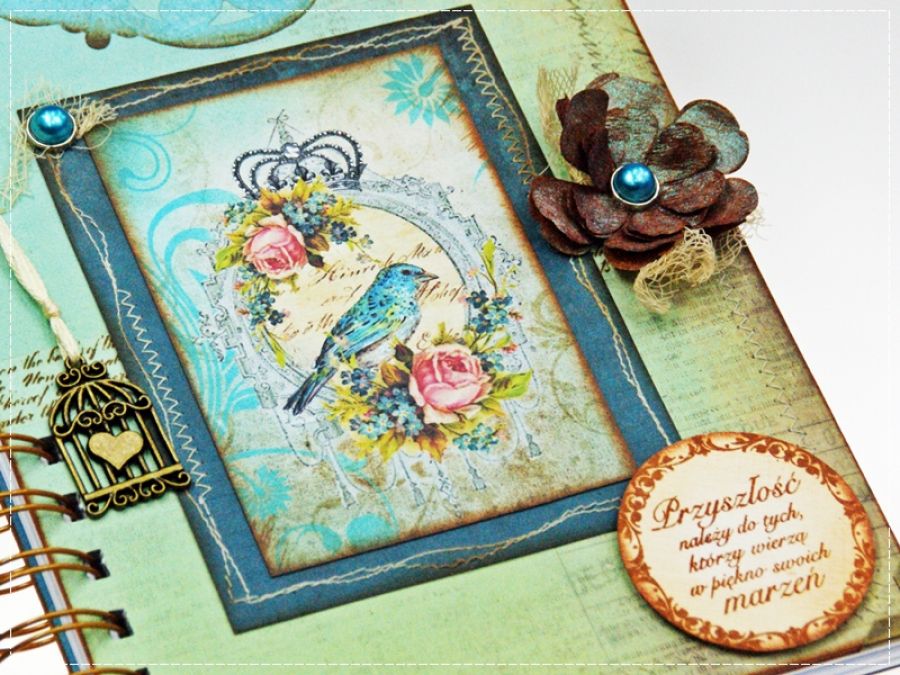 Wyjątkowy notes formatu A5 . Ozdobiony papierem do scrapbookingu, obszywanym maszynowo . Uroku dodaje grafika, metalowa zawieszka, oraz połyskujący kwiat. W środku ok 100 kartek w linię (nadruk jednostronny). Do kompletu zakładka.