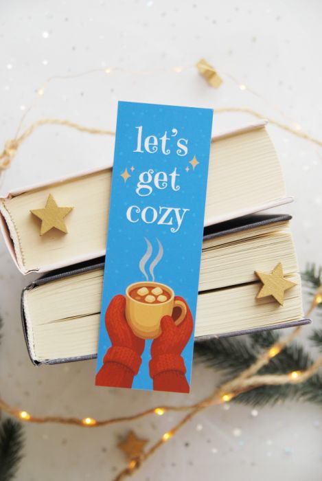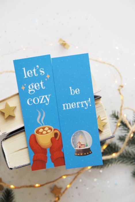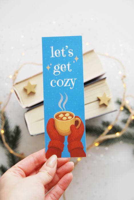 Zakładka wykonana jest z wysokiej jakości papieru i ozdobiona uroczymi, zimowymi grafikami – kubkiem gorącego kakao i śnieżną kulą. Napis „let’s get cozy” i „be merry!” przypomina, by cieszyć się małymi chwilami i magią świąt.