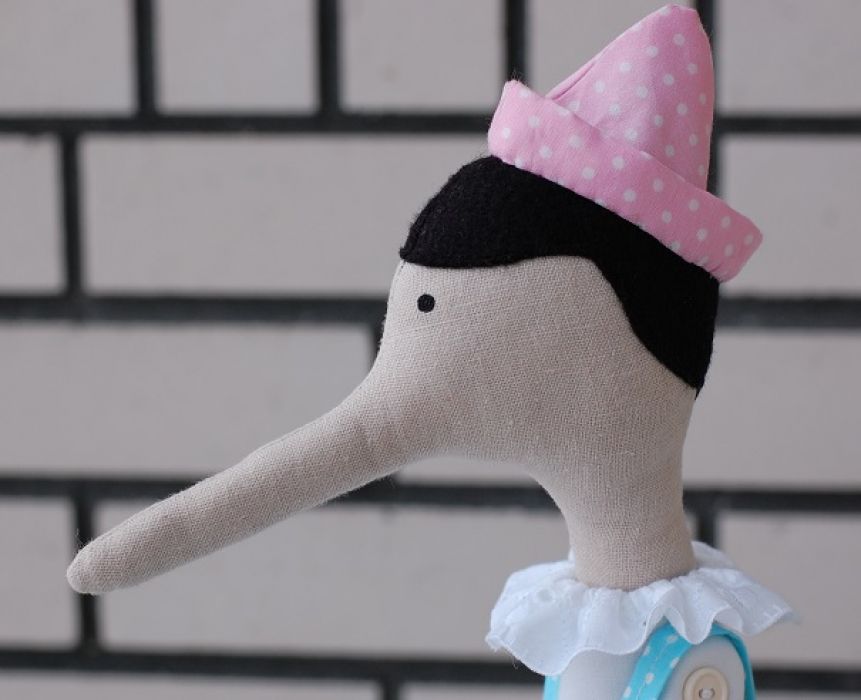 Pinokio uszyty został z tkanin bawełnianych, włoski z filcu. Utrzymany w pastelowej tonacji. W środku wypełnieniony kulką silikonową. Oczy ręcznie malowane czarną farbą do tkanin. Nogi i ręce są ruchome. Czapeczka jest przymocowana do główki na stałe, ale spodenki można zdejmować.