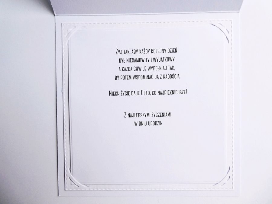 Kartka ma wklejony w środku biały karnecik, w którym umieszczona została wkładka z życzeniami.