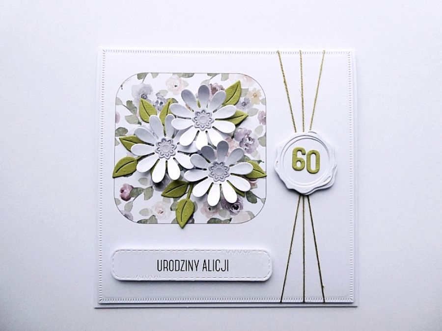 Na pastelowym kwiatowym tle w odcieniach fioletu, beżu i zieleni umieszczone zostały papierowe kwiatuszki. Dodatkową ozdobę stanowi dekoracyjny sznurek z papierową pieczęcią z liczbą.