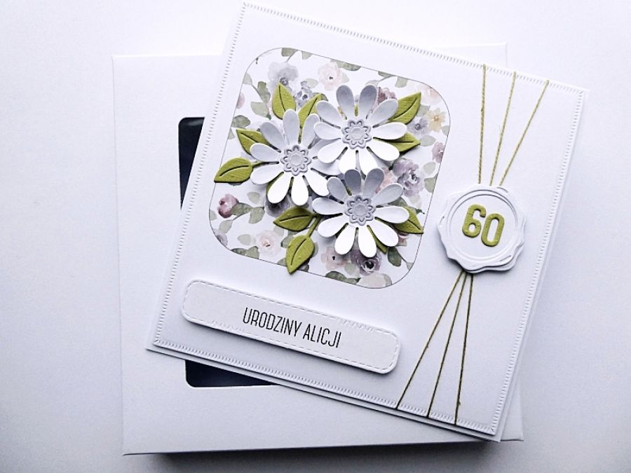 Ręcznie wykonana kartka na urodziny w komplecie z pudełkiem z okienkiem.